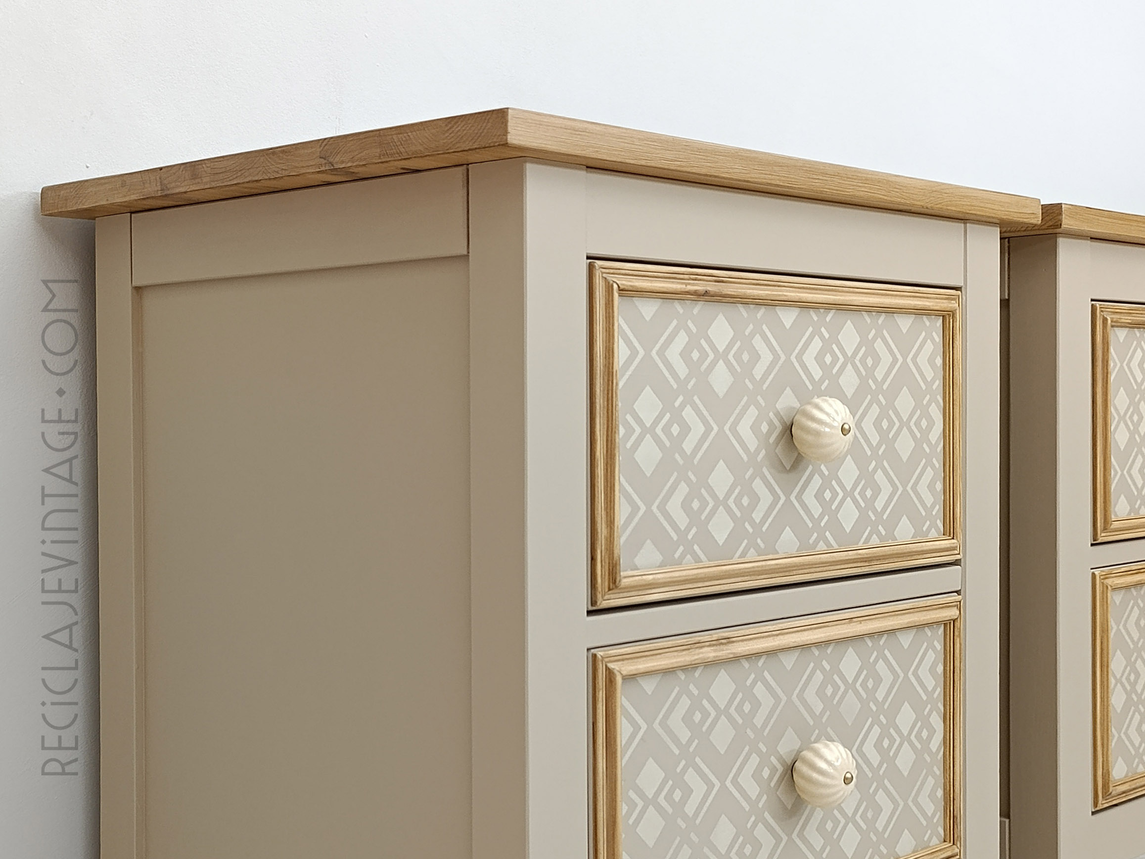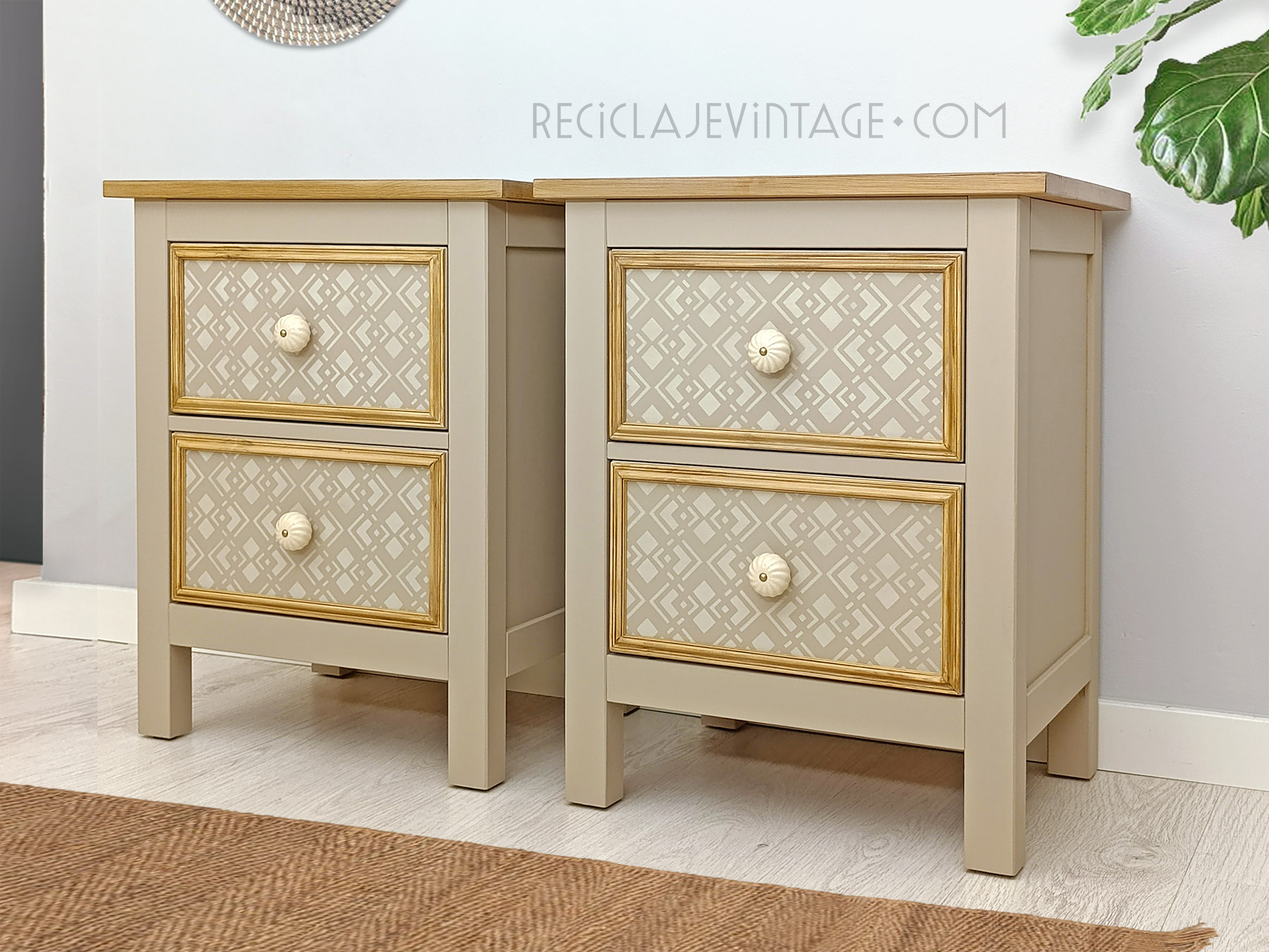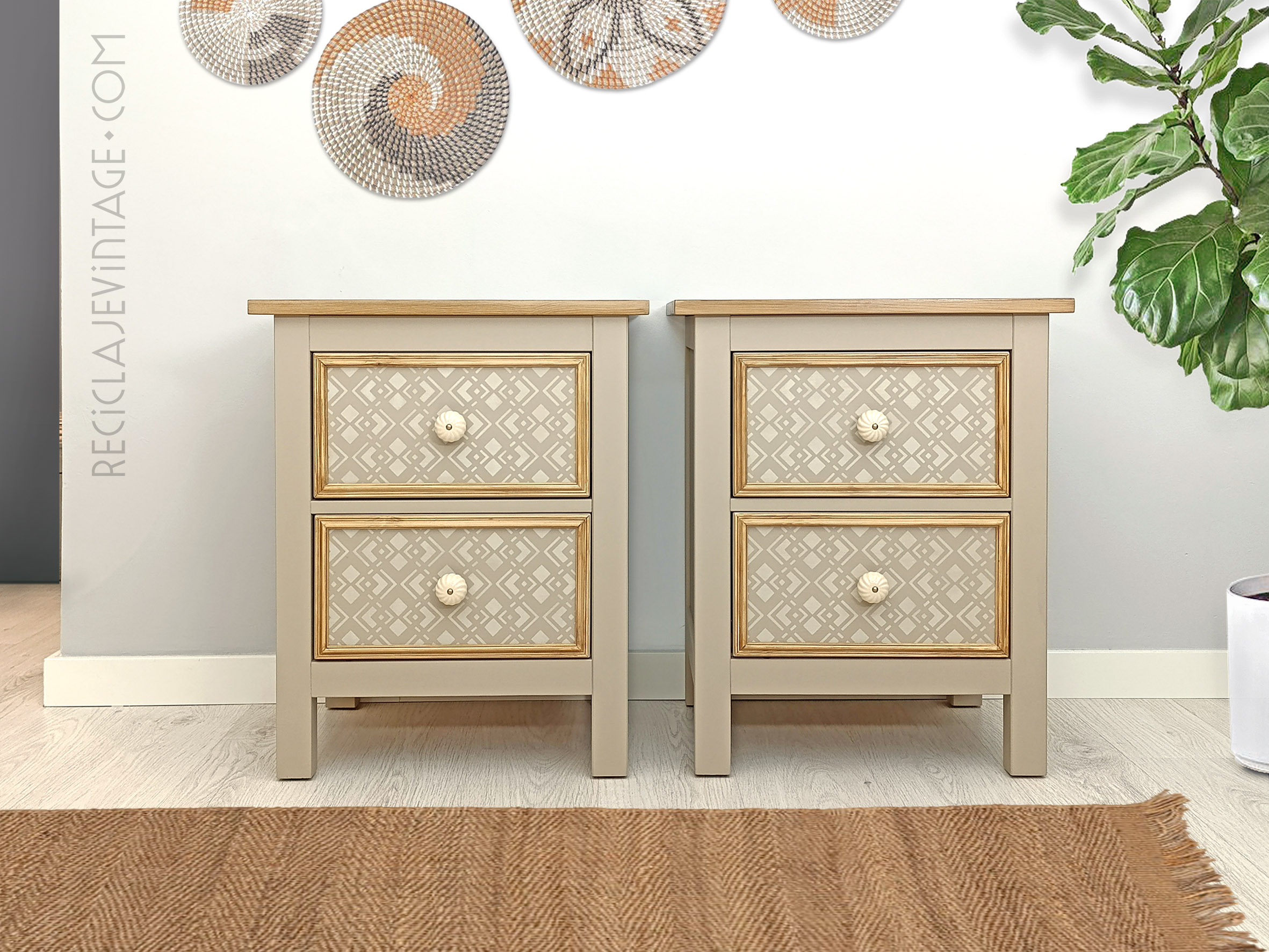 Mesillas de noche de pino macizo con patrón geométrico y pomos de cerámica.