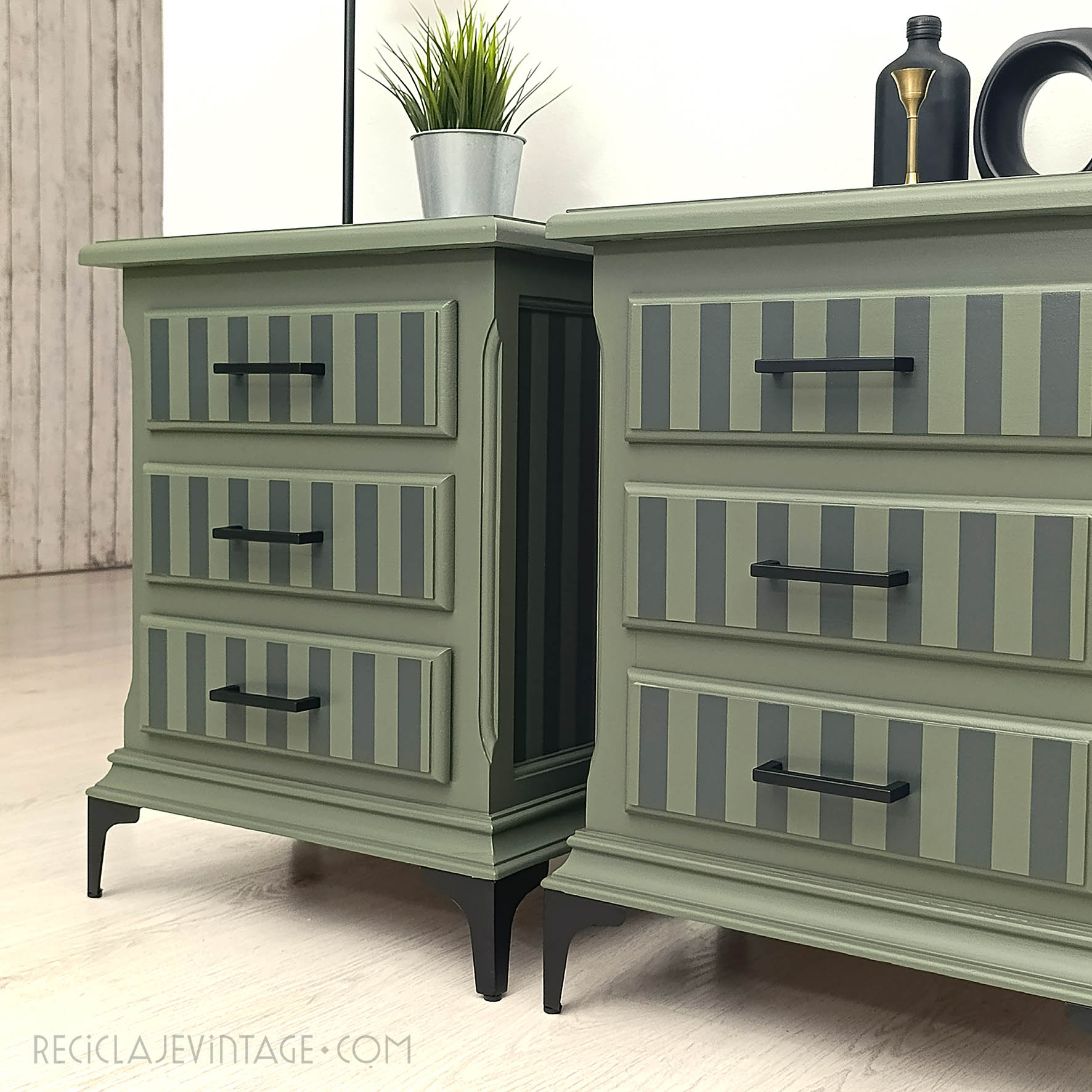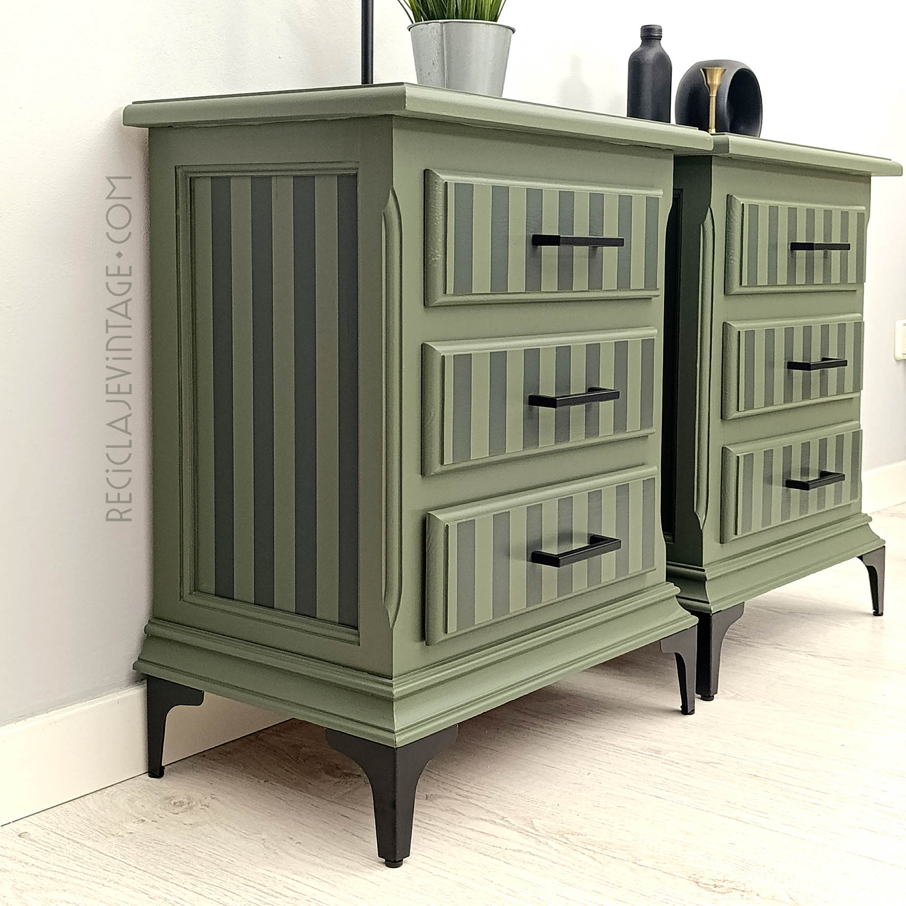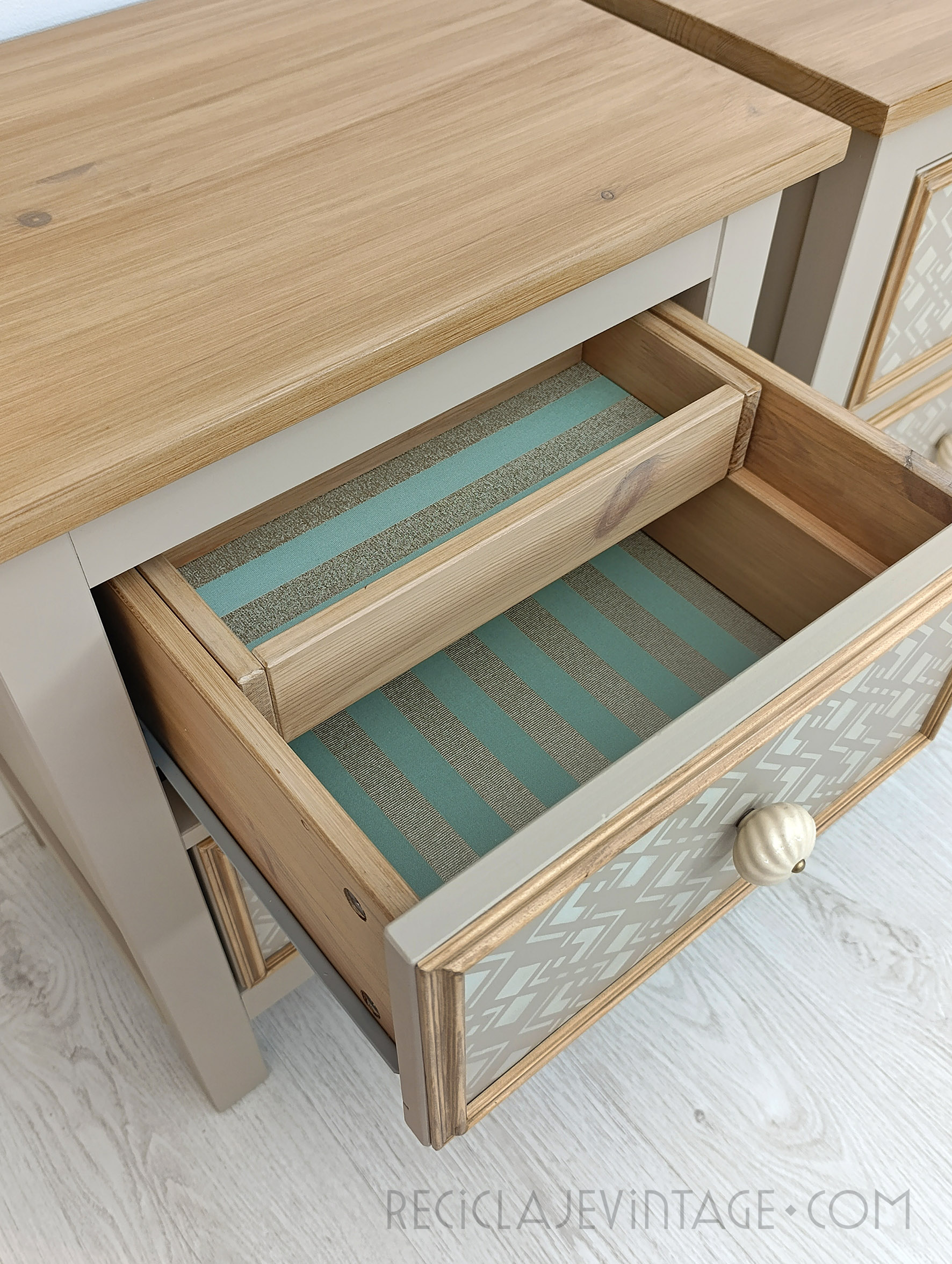 Conjunto de mesillas de noche en verde militar, con cajones empapelados en tonos crema