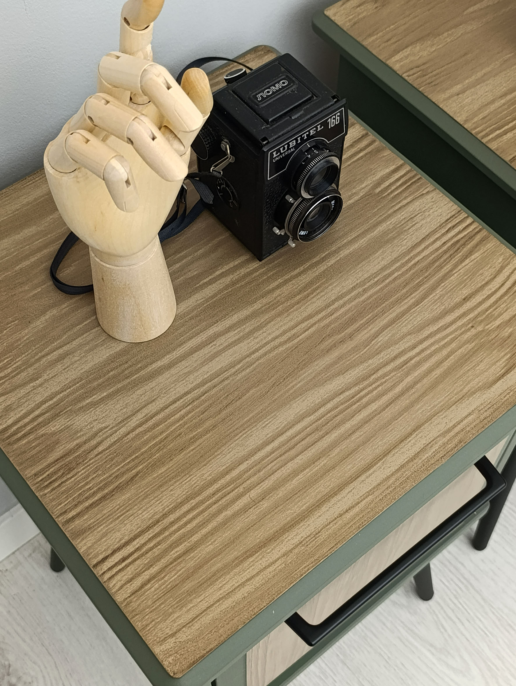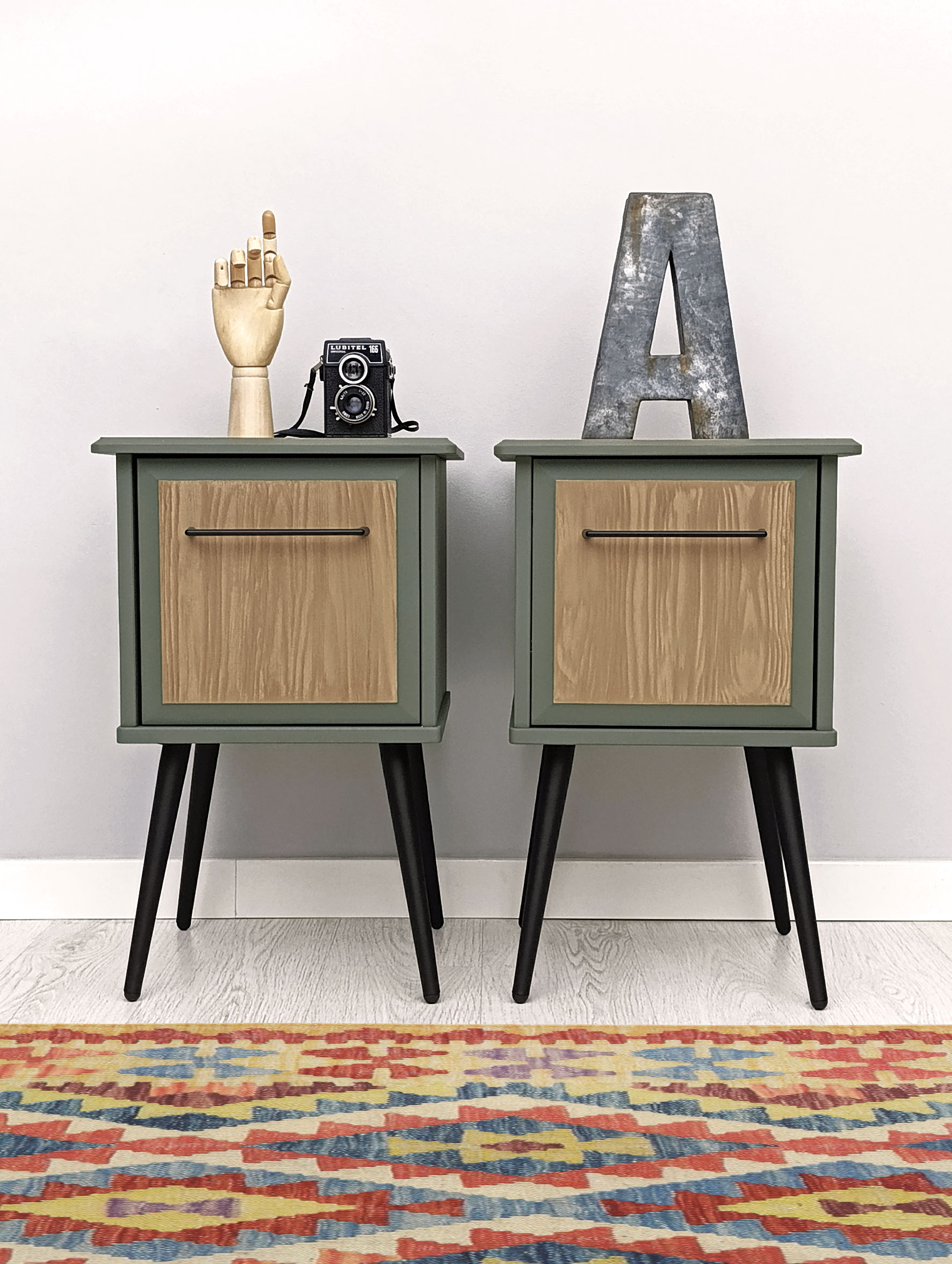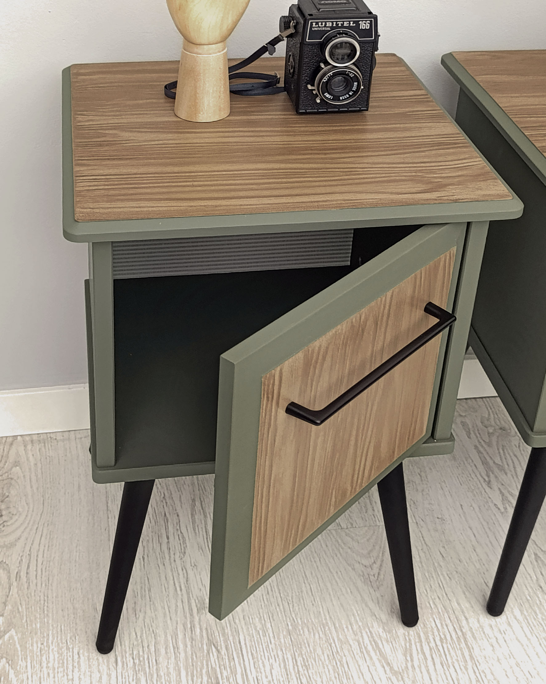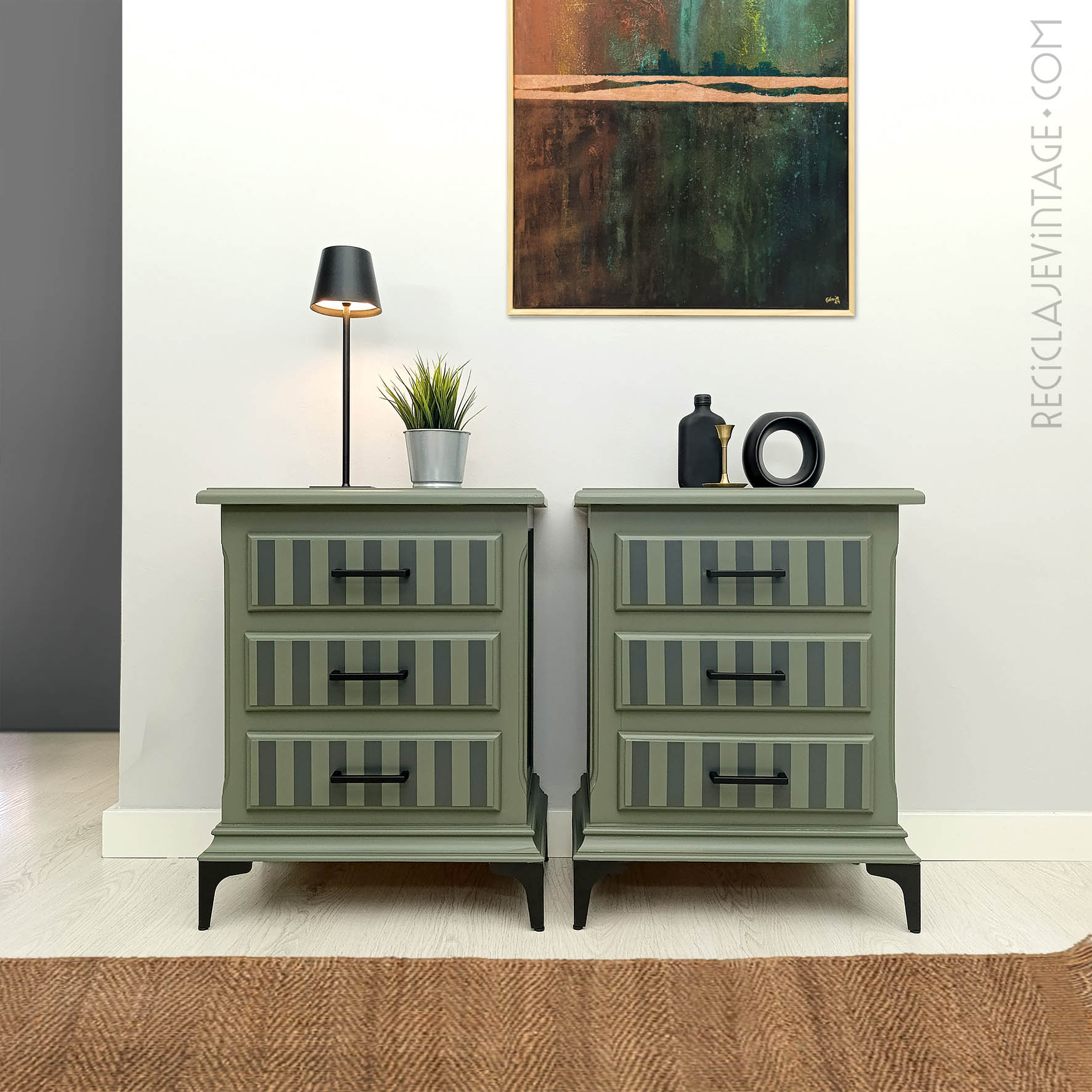 Conjunto de mesillas de noche en verde militar, con cajones empapelados en tonos crema