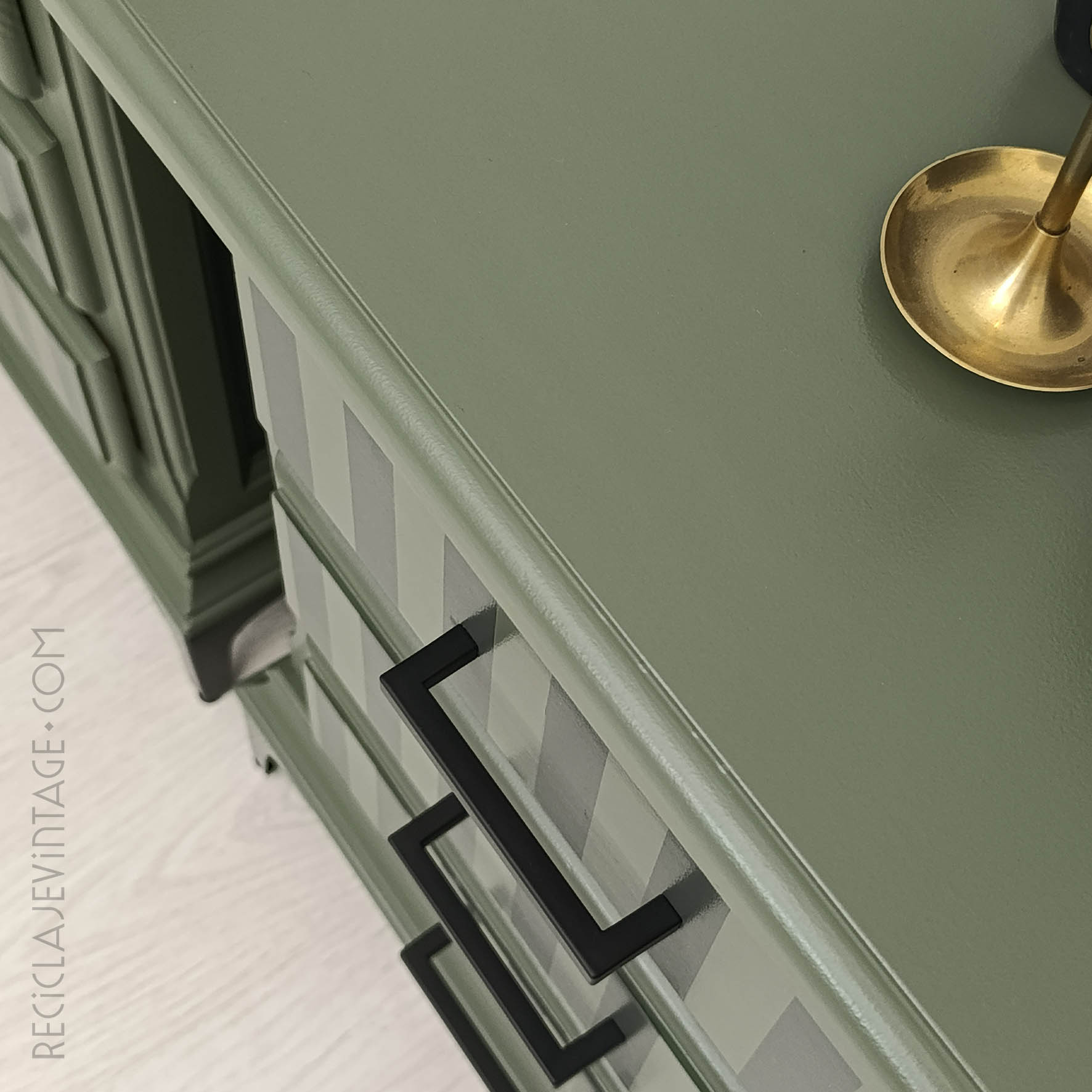 Amplia cómoda verde oliva con relieve en los frontales. Tiradores vintage macizos.