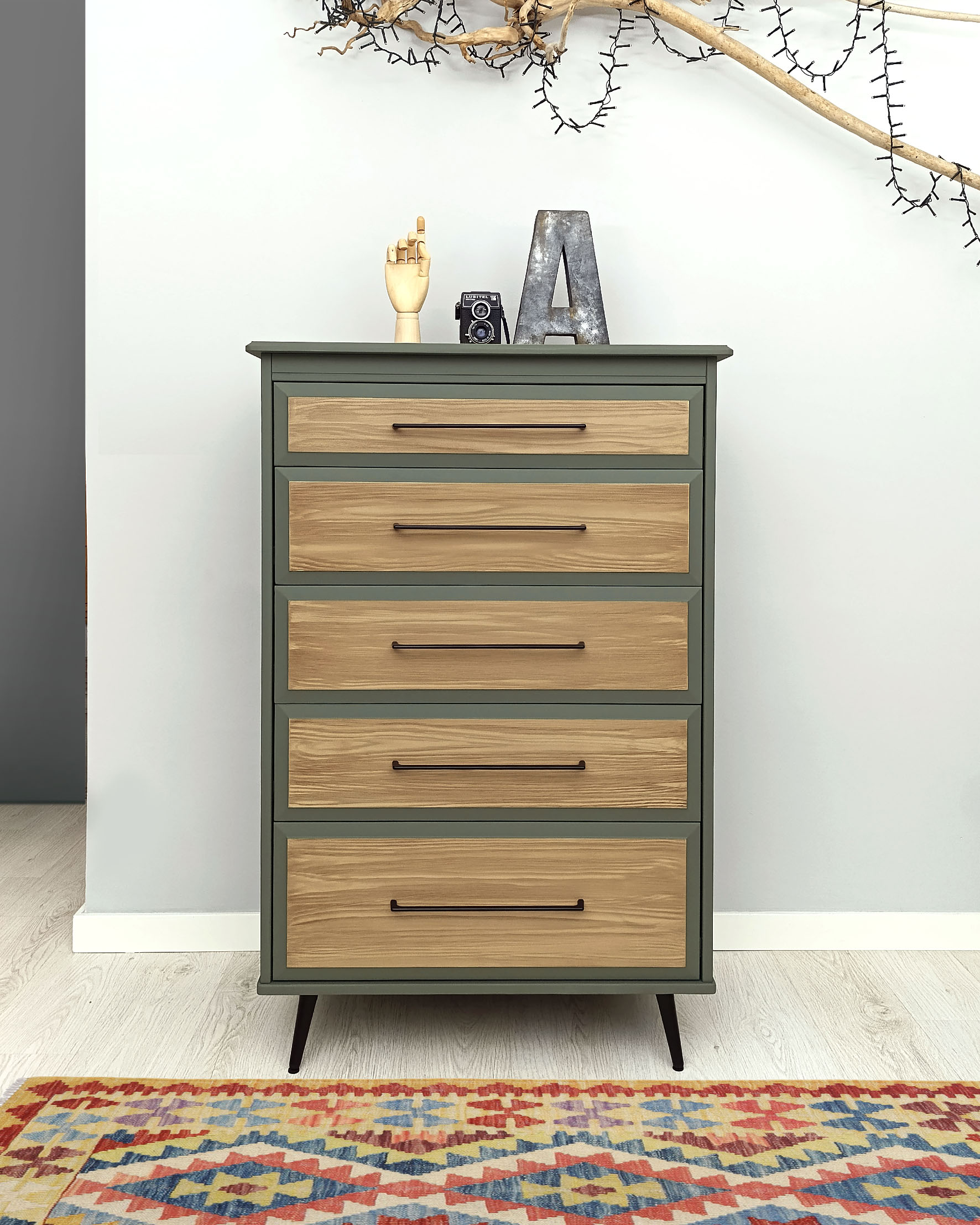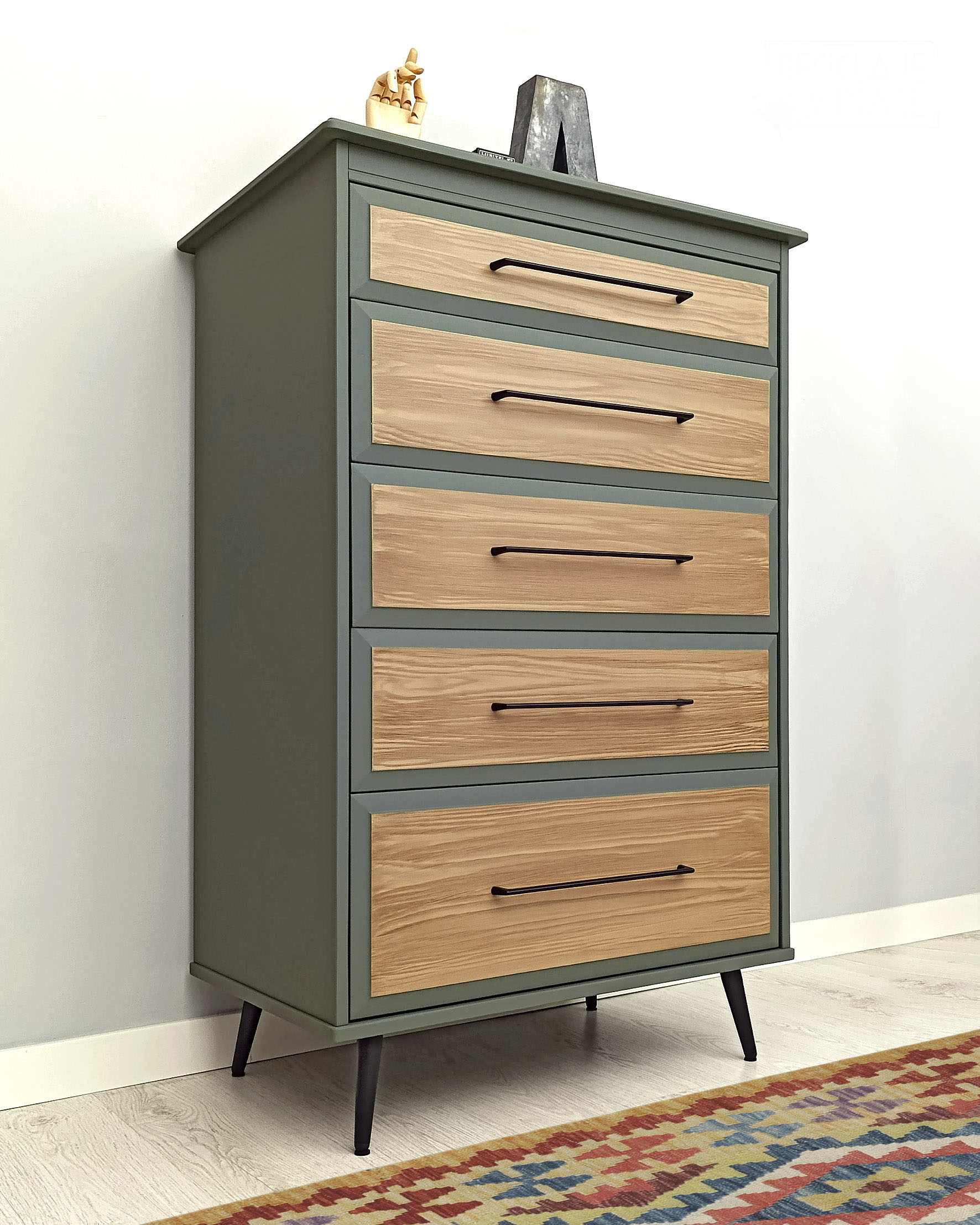 Cómoda restaurada en color roble y verde militar.