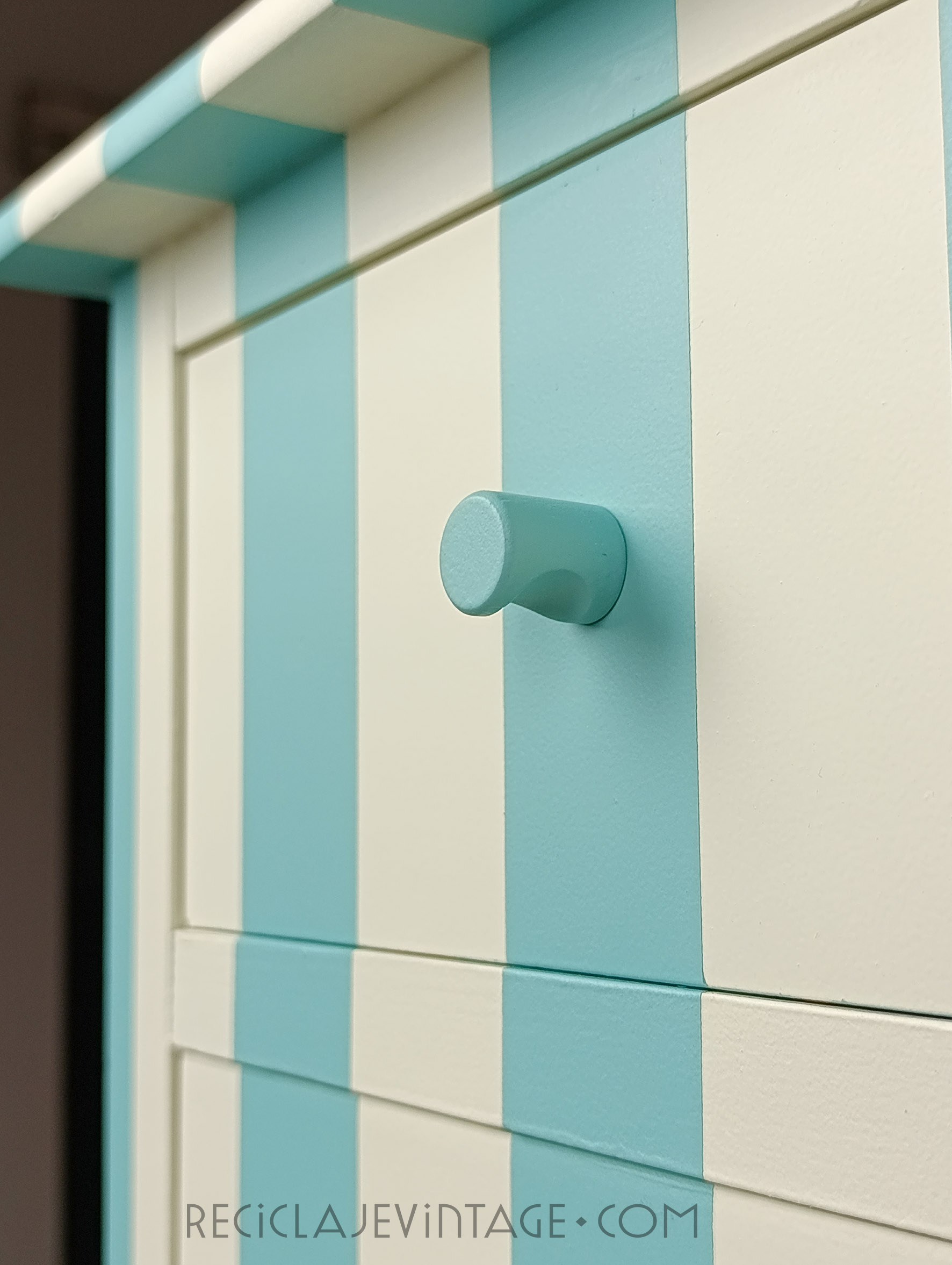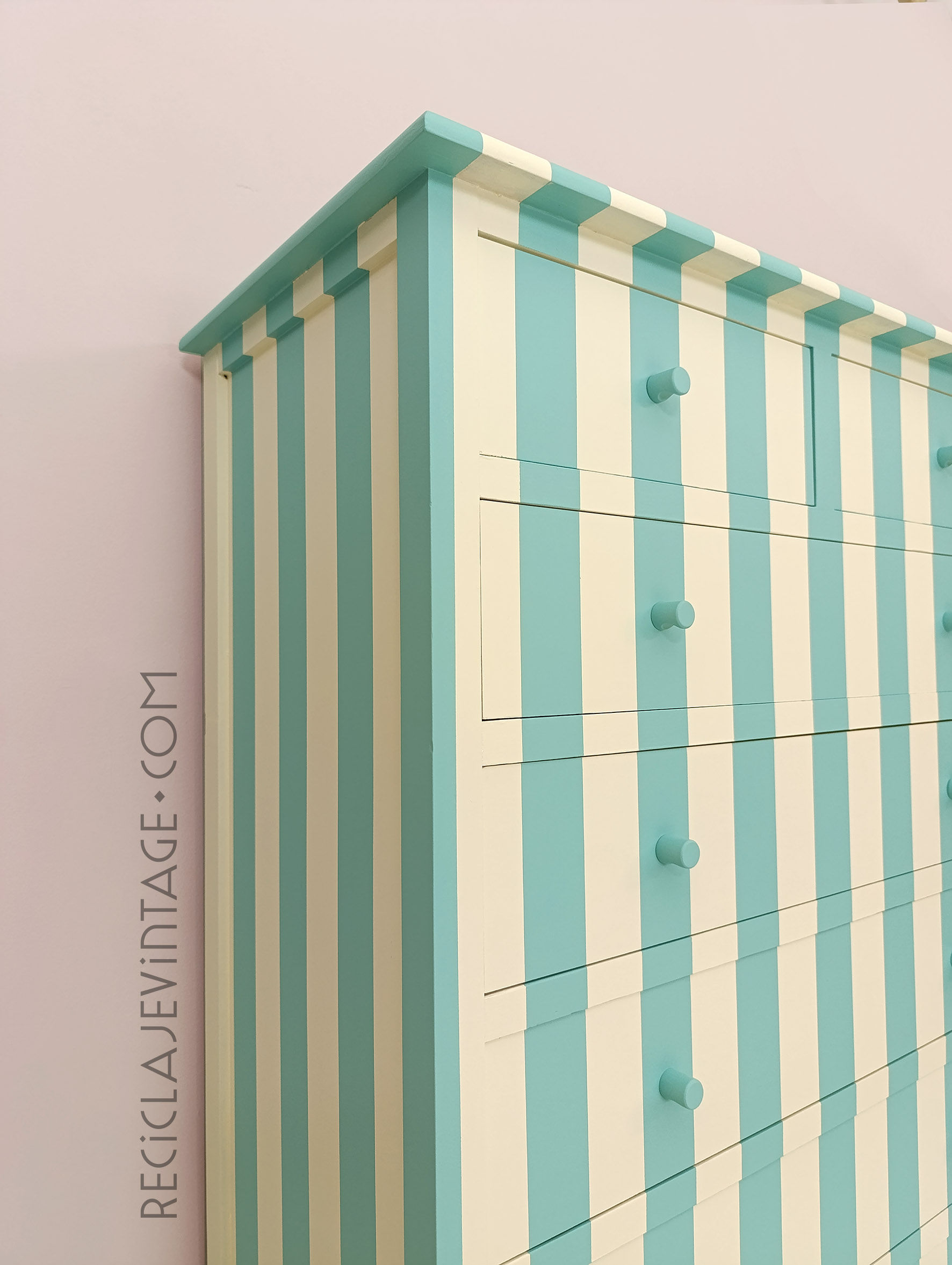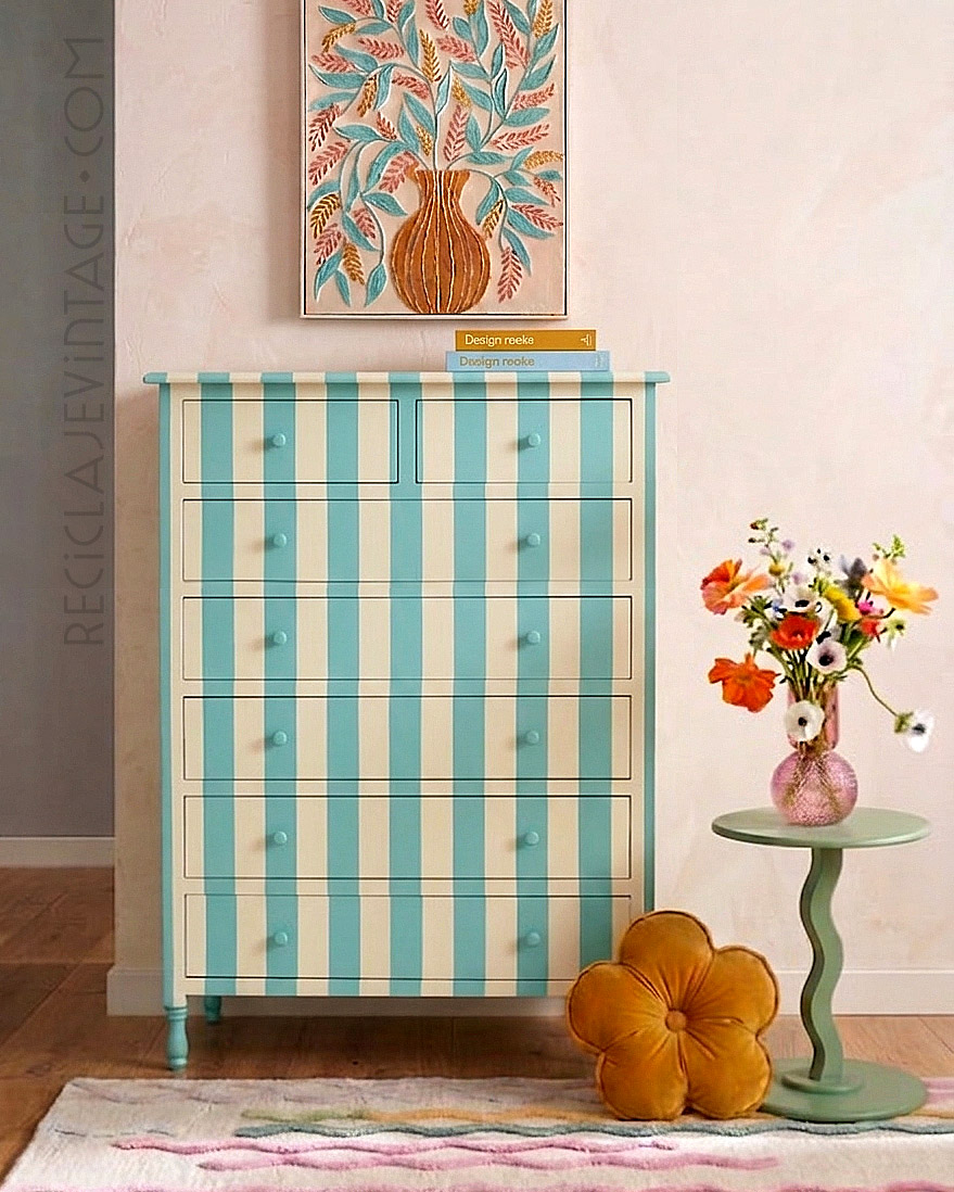Cómoda alta en madera de pino con estampado de rayas turquesa y crema.