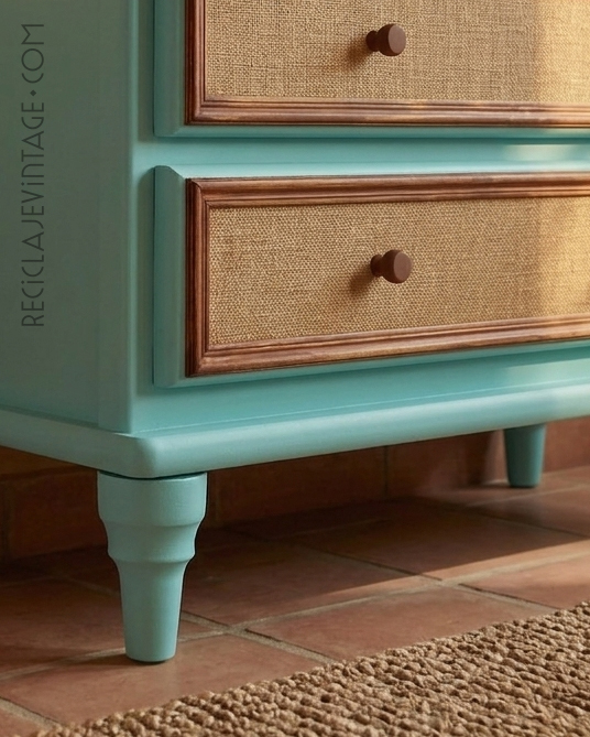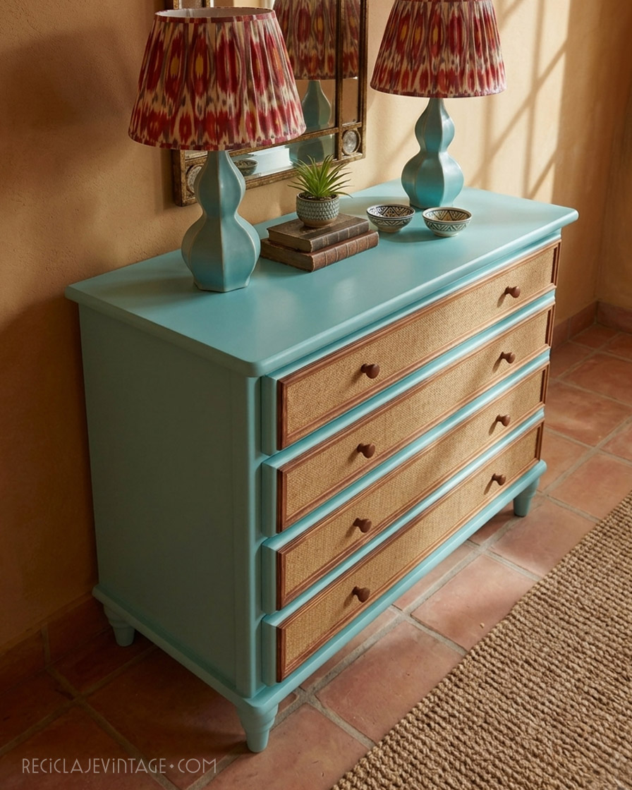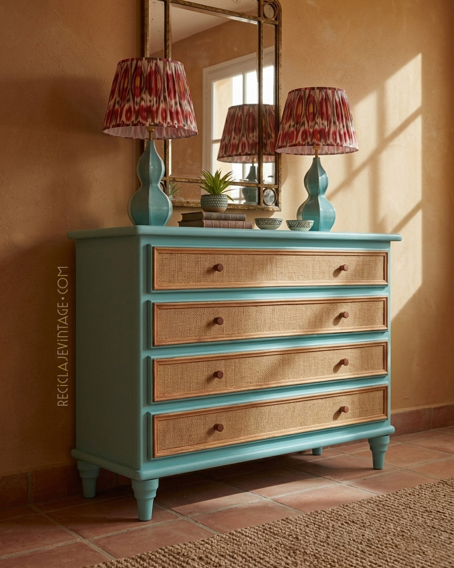 Cómoda de pino macizo con frentes entelados en yute.